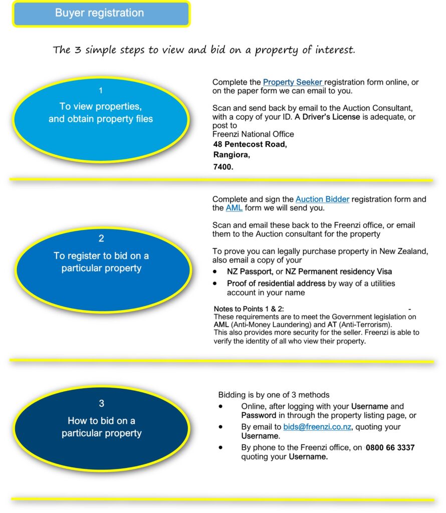 1) Sellers have the right to reject or accept any bid, not necessarily the highest bid. This decision is the sellers to make. 2) Some sellers may choose not to obtain certain property reports for their marketing. If they do obtain these, they are made available to the potential buyers 3) From 1 January 2019, real estate businesses were subject to New Zealand’s anti-money laundering regime contained in the Anti-Money Laundering and Countering Financing of Terrorism Act 2009 (the Act). This requires a potential buyer to provide their name and address, as well as proof of ID, such as a Driver’s License
